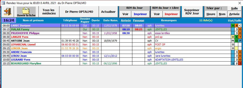 - Un suivi complet du parcours patient au sein de l’établissement, dès l'accueil, notamment par 3 colonnes synthétiques : codes couleurs, chiffres, lettres..., pour coordonner les différents examens et intervenants,